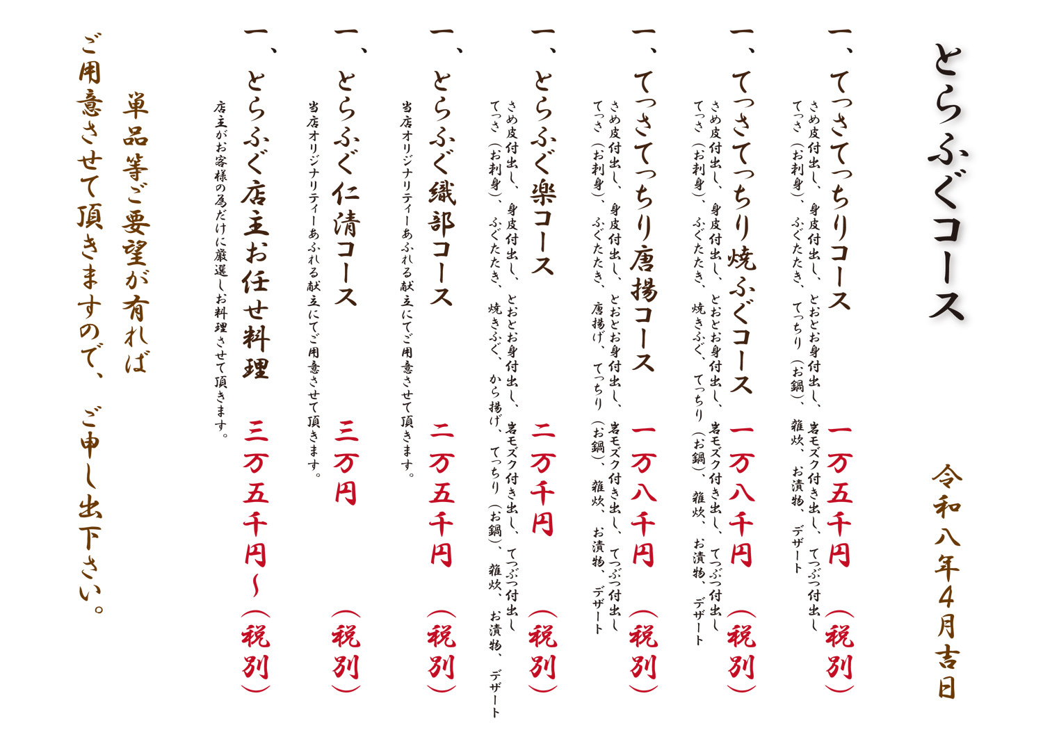 【単品】てつぶつ(ふぐぶつ切り) 1人前 6,000円